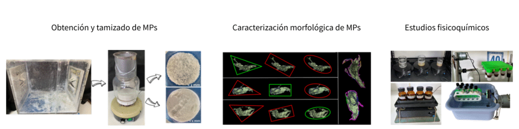 1) La degradación fotocatalítica mediante luz UV, y los procesos fotosensibilizados mediados por pigmentos naturales y luz visible. Los estudios realizados se basan, por un lado, en el análisis de la adsorción entre los diferentes MPs y los compuestos con propiedades fotocatalíticas y fotosensibilizadoras, para los cuales se utilizan técnicas de Espectroscopías UV-visible, Infrarroja, Cromatografía Líquida de Alta Resolución, Microscopía Óptica y Electrónica.